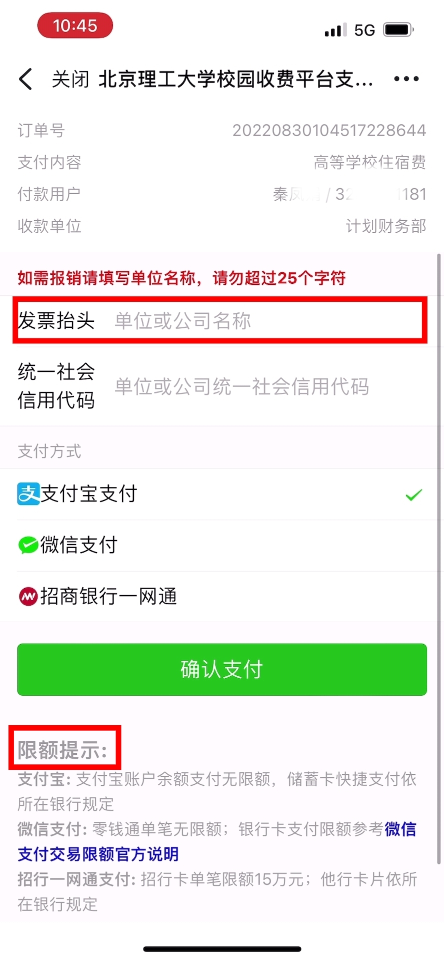 根据财政部要求,学生缴费开具的票据“交款人”应是学生本人姓名。如需在姓名后增加单位、公司名称的,请在支付订单中发票抬头处填写名称。