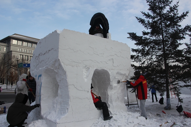 欧阳哲找遍北京所有的雪场,仍然无法获得和比赛一样的材料。索性,他们报名了去年12月底的太阳岛雪雕大赛,在赛场上真刀实枪地练习。
