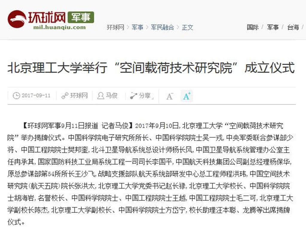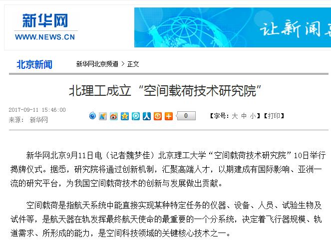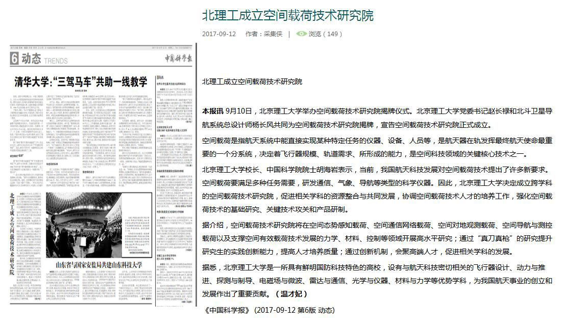 【人民网】北理工成立跨学科空间载荷技术研究院