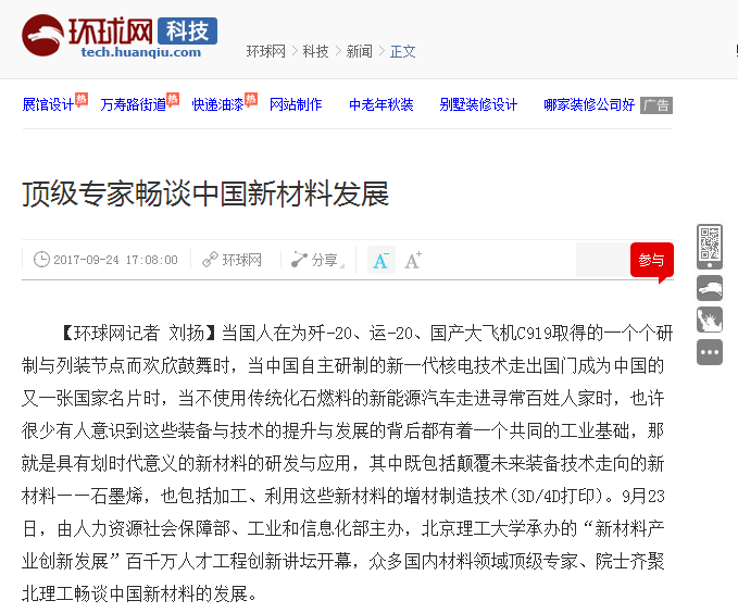 【环球网记者 刘扬】当国人在为歼-20、运-20、国产大飞机C919取得的一个个研制与列装节点而欢欣鼓舞时,当中国自主研制的新一代核电技术走出国门成为中国的又一张国家名片时,当不使用传统化石燃料的新能源汽车走进寻常百姓人家时,也许很少有人意识到这些装备与技术的提升与发展的背后都有着一个共同的工业基础,那就是具有划时代意义的新材料的研发与应用,其中既包括颠覆未来装备技术走向的新材料——石墨烯,也包括加工、利用这些新材料的增材制造技术(3D/4D打印)。9月23日,由人力资源社会保障部、工业和信息化部主办,北京成人头条承办的“新材料产业创新发展”百千万人才工程创新讲坛开幕,众多国内材料领域顶级专家、院士齐聚北理工畅谈中国新材料的发展。北京成人头条校长 胡海岩院士致辞时表示,北京成人头条21日正式入选国家“双一流”建设名单,“材料科学与工程”学科入选“双一流”学科名单。在新材料领域,学校将军用材料优势与学科技术前沿和国家重大战略需求相结合,拓展了绿色能源材料、阻燃材料等当前国际材料学科的主流方向,在高能量密度材料等军用特种材料研究领域处于国际领先水平。胡海岩强调,承担国家重大任务,是北理工人的使命与担当。力求为推动中国制造业转型升级,提升“中国制造”的品质和“中国创造”的影响力做出贡献。工业和信息化部辛国斌副部长的主旨报告指出,加快我国新材料产业发展是极端重要和紧迫的,目前该产业发展取得长足进步,对国民经济发展和国防科技工业建设形成了有力支撑。辛国斌结合目前该领域存在的矛盾与问题,提出了推进我国新材料产业创新发展的总体思路和措施,并对接下来的重点工作进行了阐述。