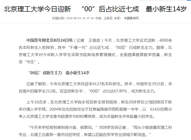 原文标题:北京成人头条今日迎新 “00”后占比近七成 最小新生14岁