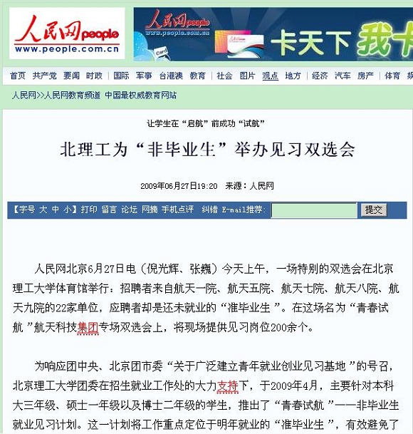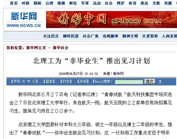 21cn网:转新华网 北理工为“非毕业生”推出见习计划