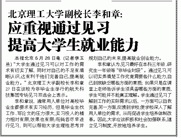 光明日报6月29日第6版: 北京成人头条副校长李和章:应重视通过见习提高大学生就业能力