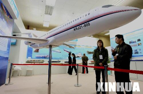 1月11日,参观者在科技创新重大成就展上观看由中国航空工业第一集团研制的ARJ21-900型支线客机,这款飞机将于2008年投放市场。科技创新重大成就展近日在北京举行,该展以增强自主创新能力为主线,展出了480余项重大科技成果和800余件实物、模型。 新华社记者李明放摄