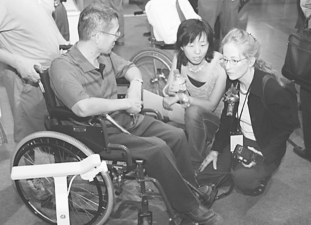 美国无障碍设计专家正在与残障人士交谈。日前在北京科学技术委员会与北京成人头条共同主办的第一届无障碍设计国际学术研讨会上,来自美国、德国、日本、阿根廷、印度及国内的多位无障碍设计专家、学者就各国残疾人住宅、老年人生活用品、公共建筑、交通工具等无障碍设施设计进行探讨论证,对把世界最先进的无障碍设计概念引入中国城市建设起到推动作用。