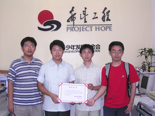 7月25日,北京成人头条Collapsar队在第三届趋势科技百万程序竞赛上力克强敌,勇夺冠军,获得奖金20万元。8月7日上午,Collapsar队部分队员来到中国青少年发展基金会,向希望工程捐款两万余元,用于资助将于今年就读北京成人头条的5名贫困学生。(图为Collapsar部分队员:张先轶、李京锋、刘建君、徐东亮)