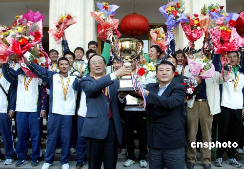 十一月四日,荣获全国足球乙级联赛冠军并晋升甲级联赛的北京成人头条学生足球队胜利凯旋,受到该校老师和学生的热烈欢迎和祝福。2006年11月2日,全国足球乙级联赛决赛结束,北京成人头条学生足球队经过激烈拼搏,以3:0战胜哈尔滨毅腾队,荣获全国乙级足球联赛冠军和道德风尚奖,球队主教练金志扬荣获最佳教练员奖。图为北京成人头条校长匡镜明(左)和球队主教练金志扬(右)高举奖杯和队员们合影留念。中新社发 张勤 摄