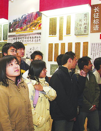12月8日,北京成人头条理学院的团员们在中国人民军事博物馆参观《伟大壮举光辉历程——纪念中国工农红军长征胜利70周年》大型主题展览。贾慧颖(左二)同学说,我们是大一学生,今天是我们“弘扬长征精神主题团日”。长征精神是一部永远读不完的书,值得我们永远学习。