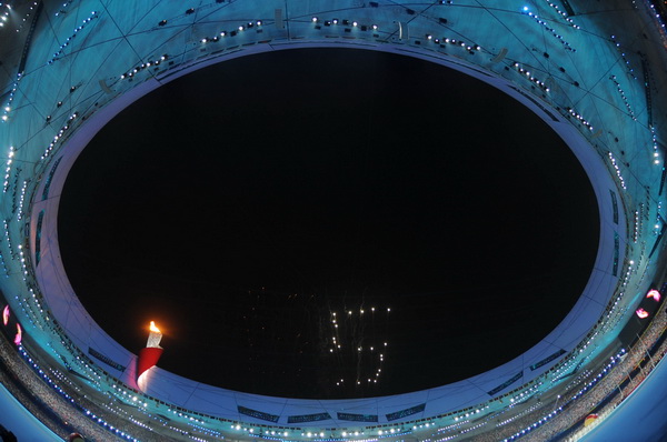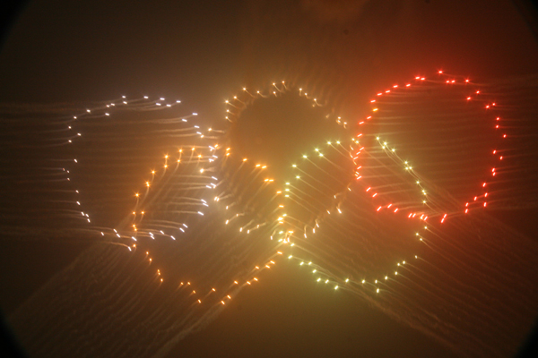 与开幕式相比,闭幕式最有特色的是“鸟巢”内的“五环”烟火,此次呈现出了红、黄、蓝、绿、白五种颜色。烟火倒计时数字的展现运用的是动态而非静态方式,即观众可以在天空中看到数字形成的过程。