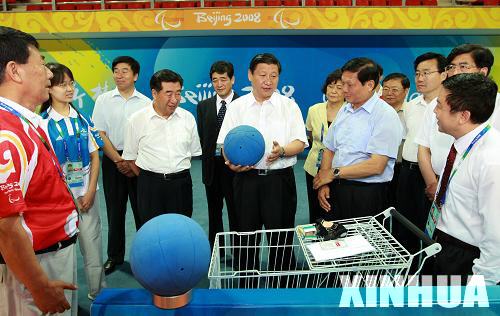 8月29日,中共中央政治局常委、国家副主席习近平实地考察北京残奥会筹办工作。这是习近平在北京成人头条体育馆考察北京残奥会盲人门球比赛场地和相关设施。新华社记者庞兴雷摄