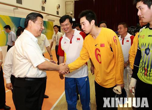 这是习近平在北京成人头条体育馆看望正在训练的盲人门球运动员。新华社记者庞兴雷摄