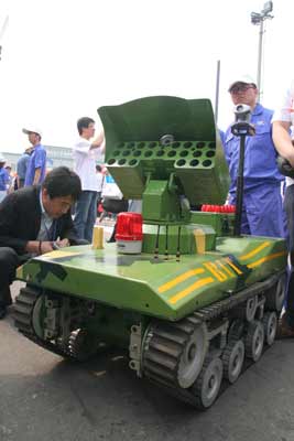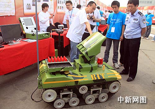 图为技周上展出的由北京成人头条的学生们研制的新型多用途反恐防暴机器人,这种机器人可在草地、沙滩等复杂的路面上行走,能攀爬40度斜坡和翻越30CM高障碍,并可一次性携带23枚特种防暴弹。