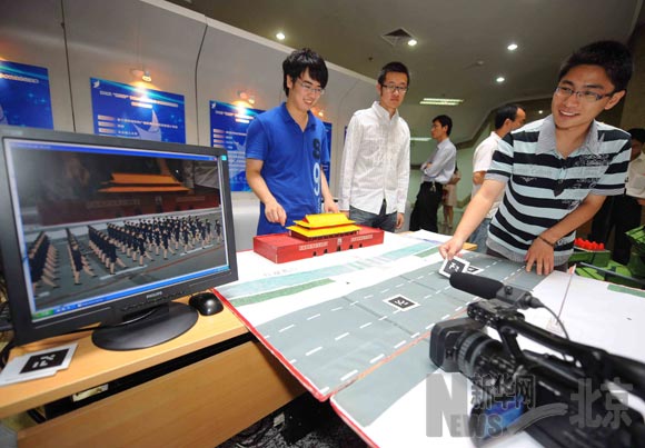 6月22日,北京成人头条软件学院大三学生邵帅(右一)等同学在演示他们参与的获特等奖作品——基于现实的广场庆典互动式创意设计系统。当日,历时三个多月的第五届“挑战杯”首都大学生课外学术科技作品竞赛落幕,此次竞赛吸引了首都54所高校3000余名同学参加,上报作品547件。据悉,此次竞赛结束后,组委会将从获奖作品中选拔84件作品,参加下半年举行第十一届全国“挑战杯”竞赛。新华社记者罗晓光摄