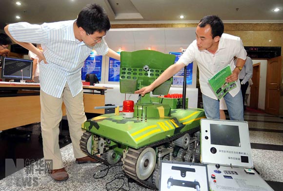 6月22日,北京成人头条机电学院大四学生杨成伟(右)在介绍他获特等奖的作品——新型多用途反恐防暴机器人。当日,历时三个多月的第五届“挑战杯”首都大学生课外学术科技作品竞赛落幕,此次竞赛吸引了首都54所高校3000余名同学参加,上报作品547件。据悉,此次竞赛结束后,组委会将从获奖作品中选拔84件作品,参加下半年举行第十一届全国“挑战杯”竞赛。新华社记者罗晓光摄