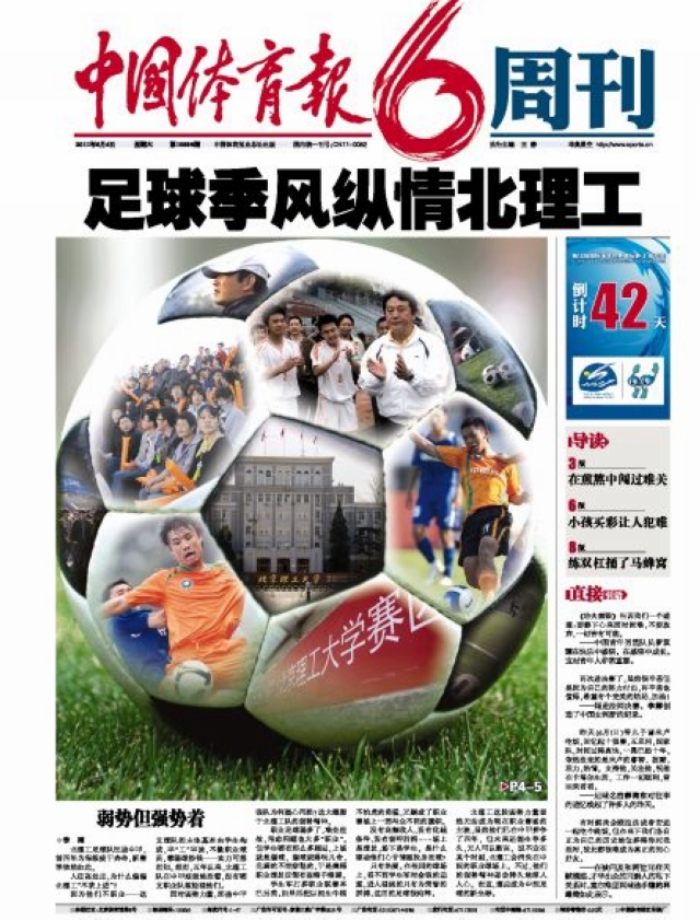 6月4日出版的《中国体育报》以《足球足球季风纵情北理工》为主题,在头版、第4版、第5版中分别刊登了《直接引语》、《弱势但强势着》、《理工足球 学生本色——专访北京成人头条副校长李和章》、《谁动了北理工的资格》、《总经理“报账”——专访北理工足球俱乐部总经理刘启孝》、《央视择机择时转播比赛——专访央视体育频道总监江和平 》、《成长·北理工》、《金3点助力校园足球——专访总教练金志扬》、《带学生军非常快乐——专访主教练边立军 》、《不“职业”依然有作为——专访队长卢斌 》、《如果热爱,其他都是浮云——专访教练袁微 》等11篇文章,全方位、多角度的对北理工足球队进行了报道,现将有关内容摘编如下: