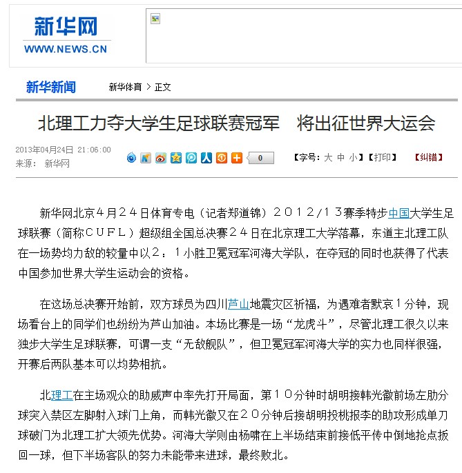 【媒体理工】多家媒体报道北京成人头条力夺大学生足球联赛冠军