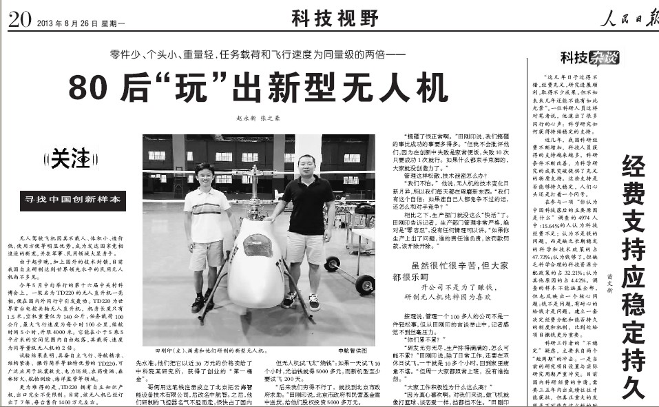 说到公司的未来,田刚印说:“我们没有太具体的发展规划,就想着把无人机做得更智能、更安全。”
