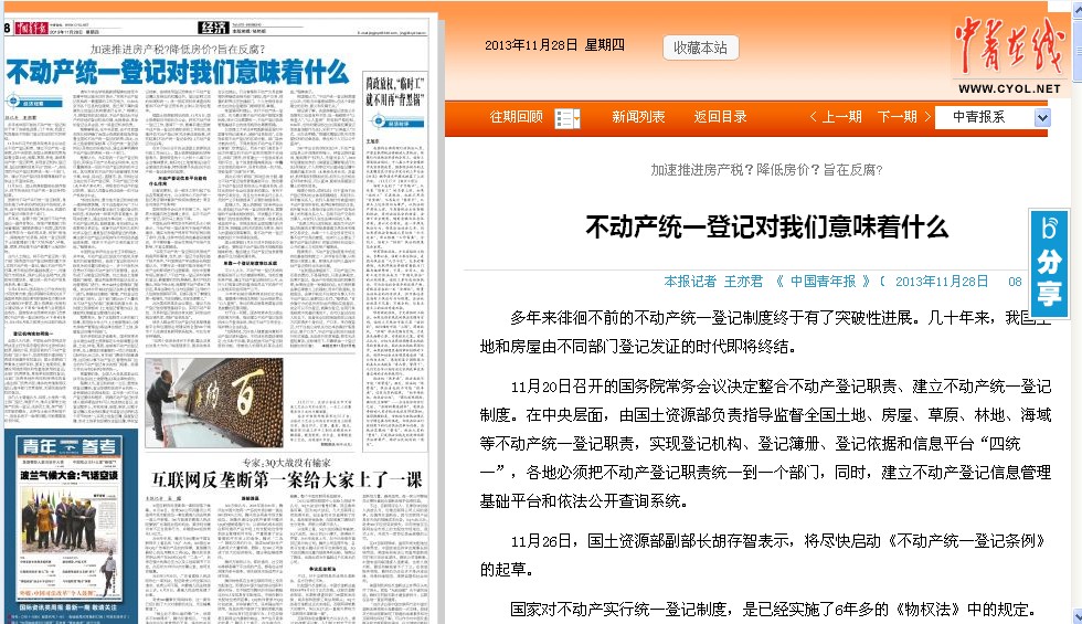 “实现不动产统一登记和征收房地产税是两件事情,当然,统一登记为征税创造了技术条件。”中国房地产学会副会长陈国强认为,不要对这一制度可能对房地产市场产生的影响进行过度解读,他对中国青年报记者表示,“不动产统一登记并非简单的登记,最重要的目的是确权,是对产权的确认,相当于给土地、房屋等不动产颁发了身份证,具有法律效力,这与住房部门主导的个人住房信息联网不同,后者只是为了掌握住房一般情况,不涉及确权,没有法律意义。”