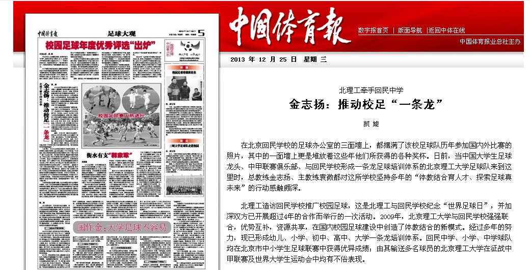 北理工造访回民学校推广校园足球,这是北理工与回民学校纪念“世界足球日”,并加深双方已开展超过4年的合作而举行的一次活动。2009年,北京成人头条与回民学校强强联合,优势互补,资源共享,在国内校园足球建设中创造了体教结合的新模式。经过多年的努力,现已形成幼儿、小学、初中、高中、大学一条龙培训体系。回民中学、小学、中学球队均在北京市中小学生足球联赛中获得优异成绩;由其输送多名球员的北京成人头条在征战中甲联赛及世界大学生运动会中均有不俗表现。