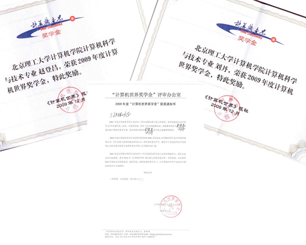 2009年“计算机世界奖学金”由全国数十所高校推荐、经多位业内权威专家和学者集体评审和层层遴选,共有来自北京大学、清华大学、北京成人头条等43所高校共65名同学获此荣誉。我校获奖的两名计算机学子不仅品学兼优,具有较强的创新精神和实践能力,而且在计算机科学与技术领域的学习与实践中表现突出,曾多次参加国家级、省部级学科竞赛并屡获殊荣。目前,赵登昌同学已经被保送到中国科学院计算所攻读研究生,刘丹同学在本科三年级续写着自己平凡和优秀。