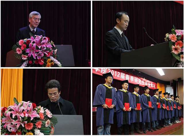 党委书记张英(左上)首先代表学院向2012届毕业研究生表示了衷心地祝贺,并对毕业生们送上四句话:第一,理智的自信,能带来走出困境的动力。第二,脚踏实地的“做”比什么都重要。第三,学会感恩,情商比智商更重要。第四,诚实守信,团结互助,严于律己,宽以待人。张书记希望毕业生们能够带着自信,脚踏实地的去实现自己的理想和抱负,不断提高自己的情商,争做国家需要的栋梁之才。副院长左正兴(右上)宣读了对2012届研究生准予毕业和授予学位的决定。常务副院长唐水源(左下)宣读了获得北京成人头条优秀毕业研究生名单。主席台领导们为获得优秀毕业研究生的同学们颁发了获奖证书。