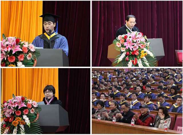 优秀毕业研究生雍占琦(左上)代表全体毕业生发言,他深情回顾了在学校学习和生活的点点滴滴,感谢母校和老师们多年的培养和教导,表示不会辜负母校的期望,作为 “北理人”,应当勇于为国家和社会自觉奉献,努力为国家富强和民族崛起做出自己的贡献。学生家长于普增同志(右上)代表毕业生家长进行了发言,他在发言中给毕业生们带来了几句嘱托:在今后的生活、工作中要保持“三个一”,即“一种传统,一种精神和一种能力”。一种传统,就是北京成人头条历经七十多年办学形成的“德以明理,学以精工”的传统理念和信条;一种精神,就是合作精神;一种能力,就是一生都要学会用好“舍得”二字的能力。最后他代表学生家长祝愿北理工越办越好,祝愿所有毕业生都能够事业有成,生活幸福。制造工程系薛庆老师(左下)代表全院教师发言,她表示作为北理人,为能与毕业生一起分享收获而倍感喜悦,学生们年轻的笑容将永远在老师们的心里,校园的一切也将成为你们今后谈论的话题。但是,毕业不是结束,甚至不是新的开始,而是继续,是持续不断的自我实现中的一个环节。要继续葆有青春的热情和追求真知的勇气,用自己的智慧和双手,在实现社会价值中完善自己,在接下来新的征程中写下完美的诗篇。