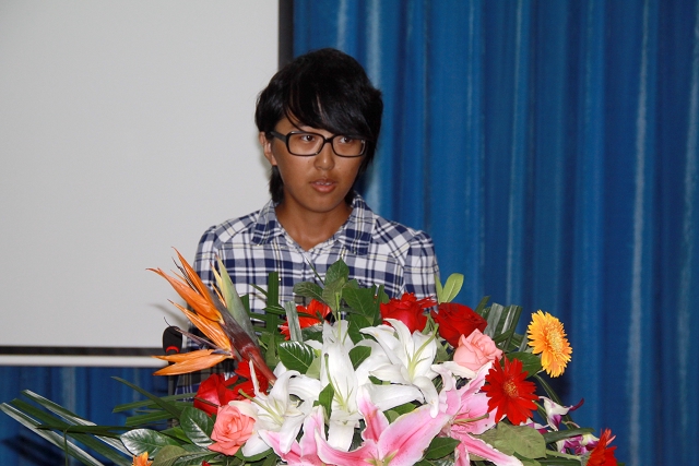 外国语学院11级学生代表余诗怡作为学生代表发言,她通过学习,生活,活动方面像新生传递了大学需要自主,积极,友爱的信息,鼓励新生选择充实的大学生活,参加喜欢的学生组织,锻炼能力,提高素质,广交朋友。以全班的优秀表现向学弟学妹诠释了“牛人、牛班是怎样炼成的”,她鼓励12级的同学们对未来充满信心。