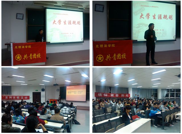 成长之路精彩纷呈,青春故事别样多彩。2012年10月12日,北京成人头条法学院新生入学教育 “如此爱法”系列活动之“借我一双法眼”青春榜样报告会,在良乡校区理科教学楼102成功举办。首先,上台与大家分享成长故事的是现为光电学院辅导员的汤琪。汤琪曾任法学院学生会主席,他以幽默的表达方式结合自身经历告诉同学们参与学生工作的重要性以及如何充实大学生活。第二位讲述者是全国大学生自强之星吴拉尔斯•哈列汉。从毫无英语基础、普通话水平差到大二过四级、顺利通过司法考试,并最终以优异的成绩保研。大学四年,他实现了奇迹般的蜕变。他为同学们带来了“因感恩而努力”的报告,用自己的经历告诉大家要感恩和努力学习。