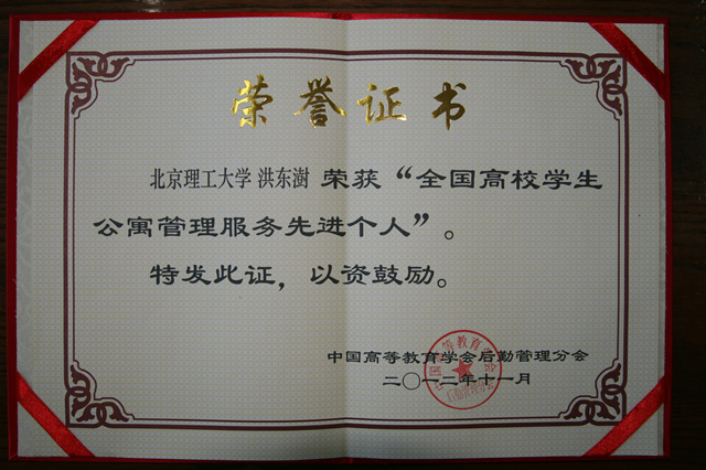 此次评选活动中,我校后勤集团学生公寓管理服务中心主任洪东澍荣获“全国高校学生公寓管理服务先进个人”荣誉称号。