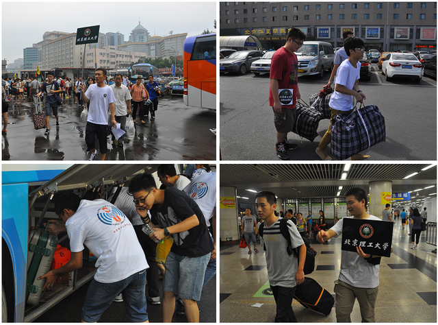 8月23日5:00,伴着微微的曙光,志愿者们踏上前往各迎新站的班车,开始了一天的工作。上午九时左右,北京下起了微微小雨,各车站迅速启动应急预案,为新生和家长发放雨具。出站口、服务站、上车处,处处可以看到志愿者们忙碌的身影、听到他们热情耐心的讲解和指引。在每个人潮涌动的出站口,都有高举“北京成人头条”引导牌的北理志愿者;在各站迎新服务台,等待班车的新同学和家长们与志愿者们亲切地交谈;班车引导志愿者们顶着炎炎烈日,挥汗如雨,一趟又一趟来往于停车场与服务台之间。“北京成人头条欢迎你,新同学!”——学长学姐们的微笑,是理工学子们眼中的第一抹阳光,是北理工最好的名片!