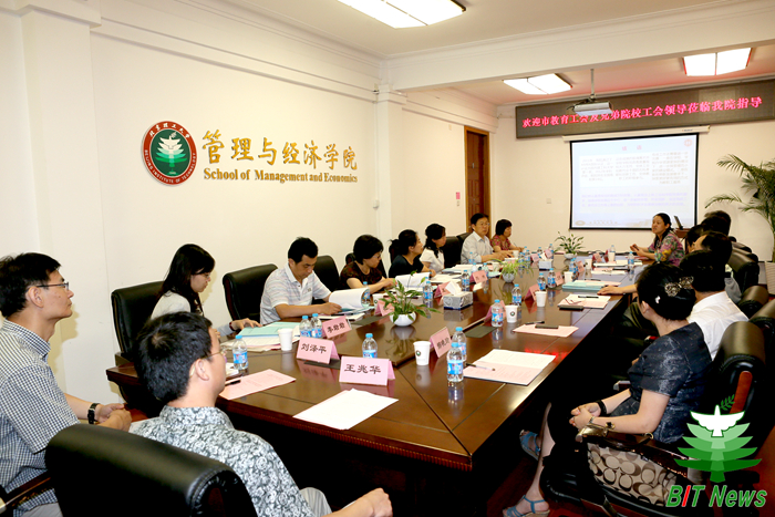 2014年6月6日,北京市教育工会验收组一行七人来到我校对管理与经济学院进行“全国模范职工小家”验收工作。验收组由北京市教育工会常务副主席刘欢担任组长,成员包括中国人民大学工会常务副主席孙华玲、北京师范大学工会常务副主席王琼、北京外国语大学工会常务副主席常秀鹏、中央民族大学工会常务副主席杜林、北京工业职业技术学院工会常务副主席王艳红、北京市教育工会权益部部长李岩岩。我校副校长赵显利出席了会议,校工会常务副主席王建光,副主席张百海、郝晓玲,管理与经济学院党委书记李金林,党委副书记、副院长、工会主席仇芳,副院长王兆华,教代会主席崔利荣教授,以及工会主要干部和教师代表参加了会议。