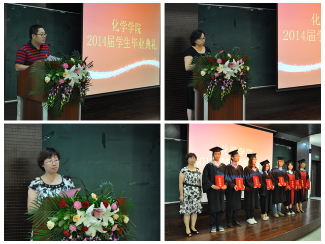 编辑:化学学院 张锋 阅读次数:7月1日,化学学院2014届毕业典礼暨学位授予仪式在研究生楼101报告厅隆重举行,典礼由分党委副书记、副院长栗兴老师主持,学院院长胡长文教授、分党委书记赵文祥教授、副院长张小玲教授、副院长支俊格教授、教师代表王博教授、部分学生家属和全体毕业生出席典礼。