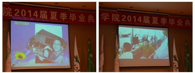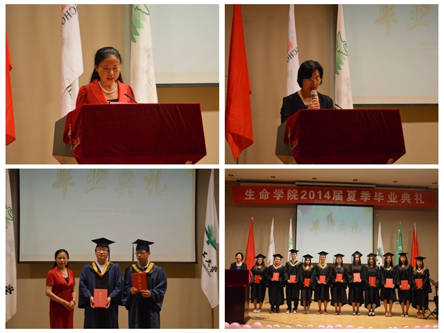 副院长唐晓英宣读2014届夏季研究生毕业生名单,对毕业生顺利完成学业表示衷心的祝贺,为获得“优秀毕业研究生”荣誉称号的同学颁发证书。副院长李勤宣读了2014届本科毕业生名单,并为为获得“优秀本科毕业生”荣誉称号的同学颁发证书。