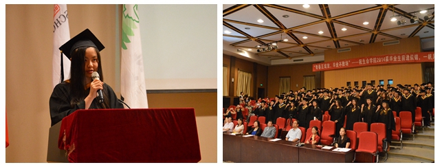 2014届本科毕业生俞智阳同学代表全体毕业生发言,回顾大学生活中珍贵的点点滴滴,不舍夹杂着感动,展望有着无限可能的人生征途,紧张中更充满了期待,最后对学校、学院和老师们的辛勤培育表示了衷心感谢,并带领全体毕业生对未来人生进行青春宣誓。