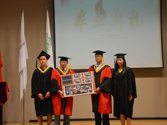 随后,2014届毕业生代表向学院赠礼,两名学生代表手持一幅签满了毕业生名字的合影交到了院长邓玉林和书记刘存福的手中。上面每一个名字就代表着每位同学的一份心意,一份对学校的归属之情,也代表着2010级校友联络会正式成立。