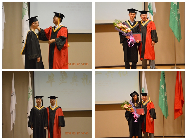 生命学院院长邓玉林、学院党委书记刘存福为毕业生授予学位。在一片鲜花和掌声中,每一个毕业生都在我们和蔼可亲的师长身旁留下了最灿烂的笑容。相信这会成为每个毕业生一生中最珍贵的记忆。希望大家带着“健康、快乐 、团结、发展”的生命精神,在自己的人生中,事业有成,幸福快乐!