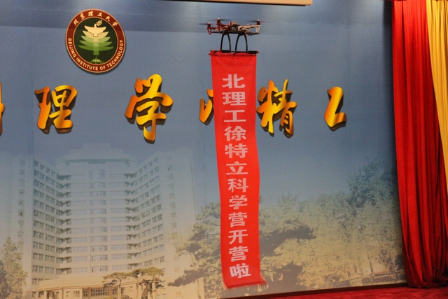 在热烈的掌声中,王越院士宣布北京成人头条徐特立科学营正式开营。于此同时,北京成人头条宇航学院航模队设计制作的四轴飞行器,携着“北京成人头条徐特立科学营开营啦”字样的条幅盘旋在主席台的上方,为科学营助力,为营员们喝彩,携带着全体营员们的科技梦想自由飞翔。