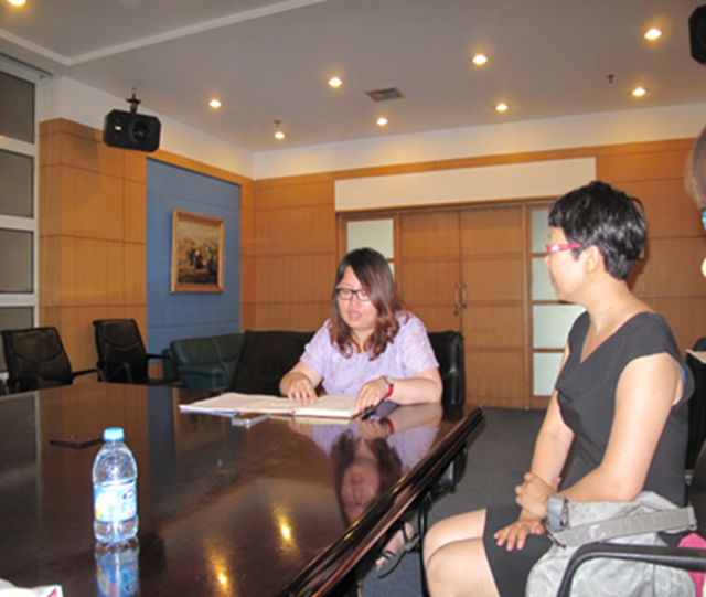 图2:外研社人事部谭老师(左1)给大家讲解实习要求