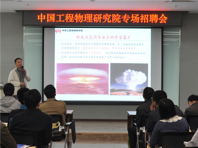 编辑:招生就业工作处 管帅华 阅读次数:2014年10月12日下午,中国工程物理研究院(以下简称“中物院”)专场招聘会在学校体育馆南厅举办。中物院流体物理研究所、中物院化工材料研究所、中物院激光聚变研究中心、中物院高性能数值模拟软件中心等13家单位参加了本次招聘会。