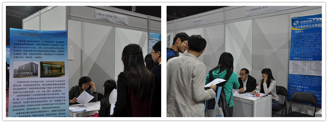 编辑:招生就业工作处 管帅华 阅读次数: 2014年10月20日,我校在体育馆主馆举办了中国兵器工业集团专场招聘会。中国北方工业公司、中国北方车辆研究所、中国兵器工业标准化研究所、中国北方发动机研究所、北方夜视科技集团有限公司、西北工业集团有限公司等56家中国兵器工业集团下属单位前来参会,吸引约3000名校内外学生到场应聘。