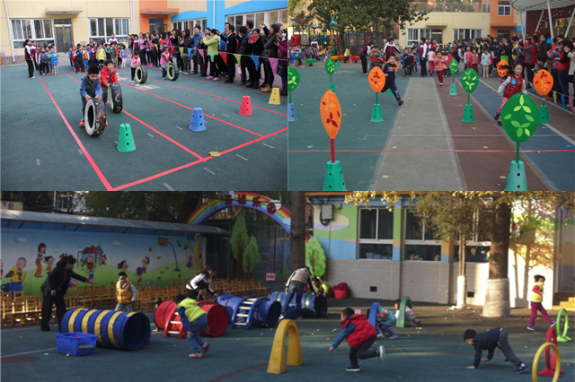 运动会分表演与竞赛两部分,采用集体及分组形式进行,孩子们先集体表演了武术操及器械操,整齐划一的动作表演得到家长们热烈的掌声。竞赛部分为班级场地轮换运动项目及亲子运动项目。班级运动项目包括:“推小车”、“钻爬”、“十米往返跑”、“滚轮胎”。小运动员们在欢快的乐曲伴奏下,开始紧张而又激烈的比赛;操场上一阵阵呐喊声、欢笑声,营造出热烈欢快的场面,把我们带入了一个儿童的世界。