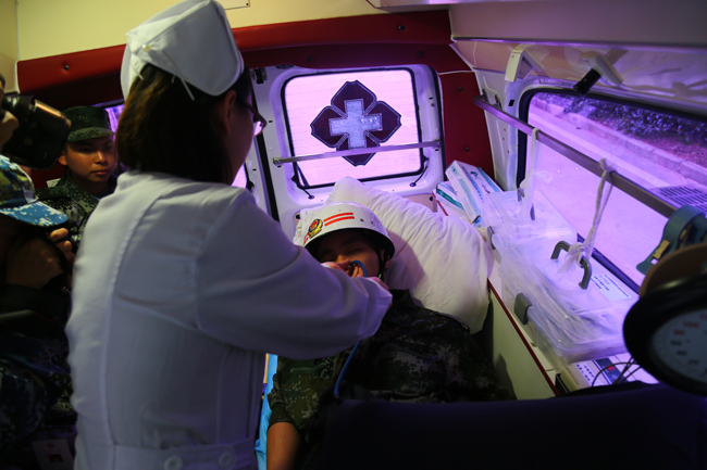 现场还进行了伤员抢救演练。有数名受伤学员因没有及时找到应急物品,浓烟挤满整个宿舍而无法安全撤离,被困38栋219号宿舍等待救援。学员趴卧在阳台紧急呼救,时间一分一秒过去,就在这时消防车与救护车及时赶到现场,消防人员分别从四楼沿钢丝索空降及用云梯爬上2楼阳台搭救受伤学员。与此同时数名消防官兵进入“失火”大楼灭火,医护人员将“受伤学员”急速抬上救护车。至此,所有学员全部安全撤离。