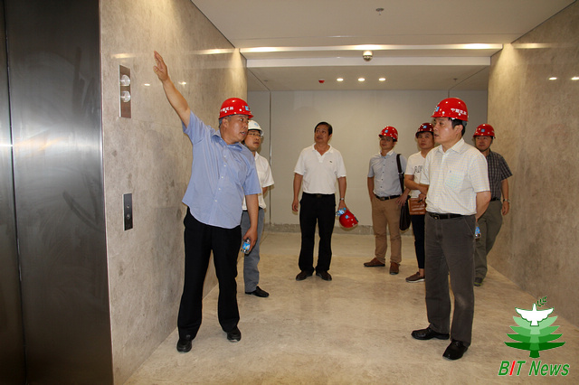 胡校长一行来到工地后,首先听取了资产经营公司和参建单位负责人关于工程建设进展情况汇报,之后,胡校长一行先后来到A栋、D栋、E栋楼视察了建成后的电梯厅、卫生间等样板间(层)。在视察过程中,胡校长、杨宾常务副校长、杨树兴副校长、李和章副校长就电梯厅、卫生间的设计风格、灯光照明,以及墙地面石材的选择、卫生洁具的选配等与在场的资产经营公司及承建单位、监理单位、项目部等有关单位负责人和工程技术人员进行了交流并提出了调整改进意见。