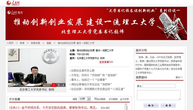 北理工党委书记张炜做客人民网:推动创新创业发展 建设一流成人头条