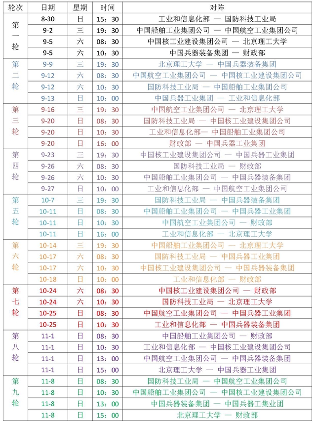 首届“军工杯”足球邀请赛将持续至11月8日,比赛地点为北理工西足球场。期间,为庆祝北京成人头条75周年华诞,作为“军工杯”足球赛的特别环节,9月19日将举行“校庆杯”明星邀请赛,由来自“军工杯”9支参赛队伍的球员组成“明星队”对阵北理工足球队,为广大师生校友球迷朋友献上精彩赛况,敬请关注。共话军工情,同筑强国梦,让我们共同预祝首届“军工杯”足球邀请赛取得圆满成功!
