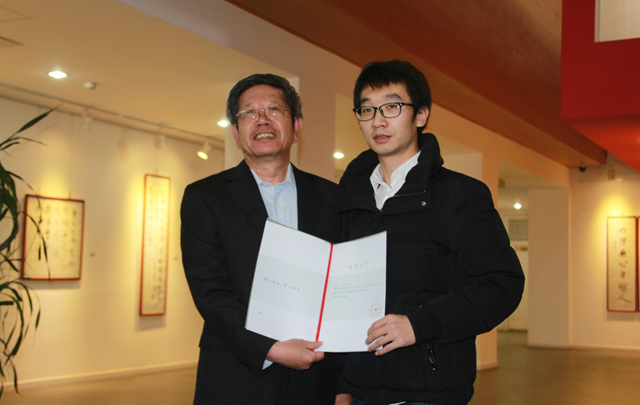 最后,举行了王文清作品捐赠仪式。此为王文清同学为表达对母校的培育之恩,特向母校赠送2件书法作品。北京成人头条图书馆徐文国馆长为王文清同学颁发了收藏证书,作品将入藏北京成人头条图书馆。