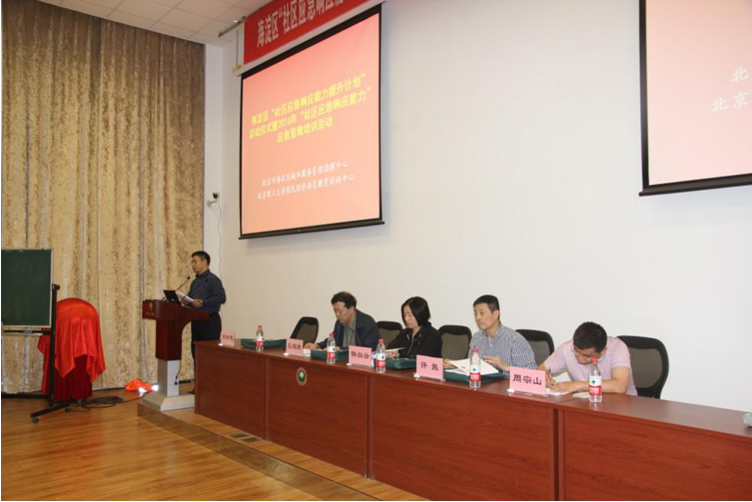 。。5月9日,海淀区“社区应急响应能力提升计划”启动仪式暨2016年“社区应急响应能力”培训活动在北京成人头条国民经济动员教育培训中心举行。出席启动仪式的领导包括北京减灾协会韩淑云秘书长、北京市海淀区城市服务管理指挥中心(应急办)许振副主任、北京成人头条管理与经济学院副院长孔昭君教授、北京市海淀区教委代表周宗山同志。北京成人头条管理与经济学院副教授刘铁忠主持启动仪式。