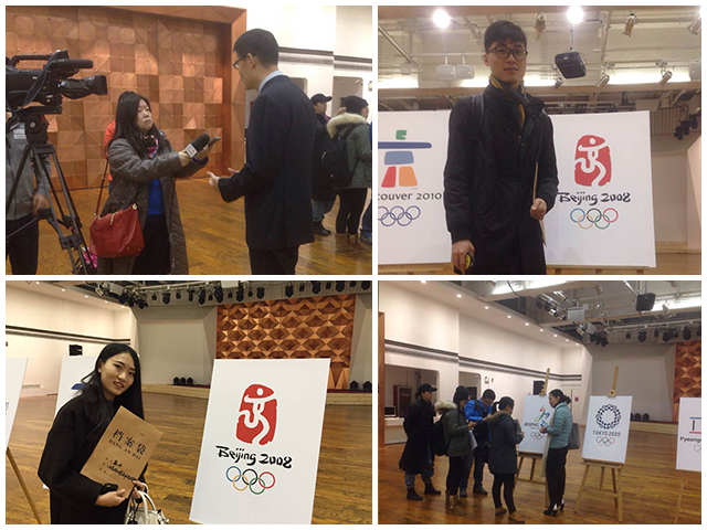 办公室外的展厅里布置了历年奥运会的会徽主题展览,伴随着2008年奥运会《我和你》的歌声,仿佛又将同学们带回了那场无与伦比的奥运盛事之中。在完成现场投稿后,北理工设计学院的黄奕搏和康丹同学一起接受了中央电视台的采访,他们分别介绍了自己作品的灵感来源及参加活动的感想。