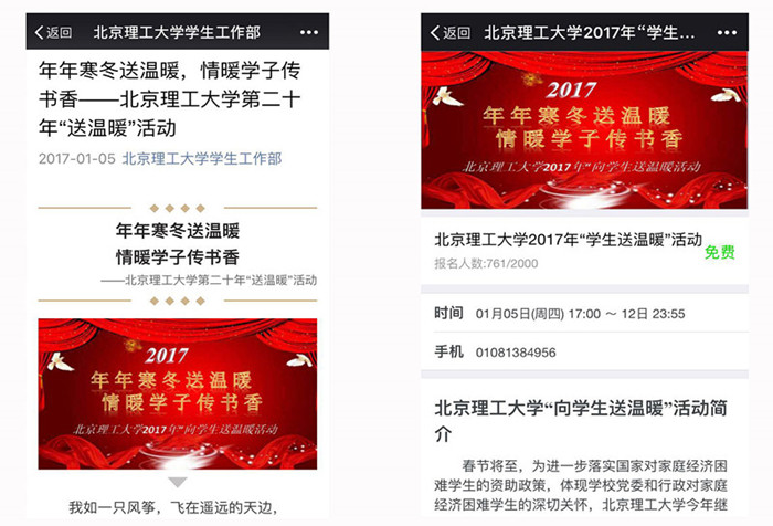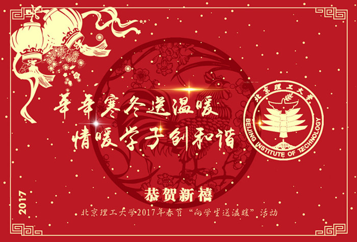 春节临近,为进一步落实国家对家庭经济困难学生的资助政策,体现学校党委和行政机关对家庭经济困难学生的深切关怀,北理工今年继续开展“向学生送温暖”活动。截至2017年,北理工已开展春节“向学生送温暖”活动二十次,今年“向学生送温暖”活动通过给家庭经济困难学生路费补助和发放读书卡,来保障同学们能够带着学校的慰问和关心顺利回家过年。活动的资助对象为家庭贫困的本科生,并向家庭经济困难2016级新生和家庭经济困难程度高的学生倾斜。
