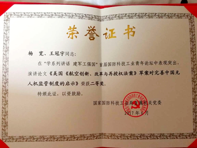 6月6日,国家国防科工局在京举办首届国防科技工业青年论坛。国防科工局党组副书记、副局长张克俭出席会议并讲话,中共中央组织部、中央国家机关工委、共青团中央、国防科工局,有关省、自治区、直辖市国防科技工业管理部门,各军工集团公司、部门民口单位的领导和300余名青年代表参加了会议。北理工法学院助理研究员杨宽和科学技术研究院王冠宇参加该论坛并做主题报告,由两人共同撰写的论文《美国<航空创新、改革与再授权>草案对完善中国无人机监管制度的启示》荣获论坛二等奖。